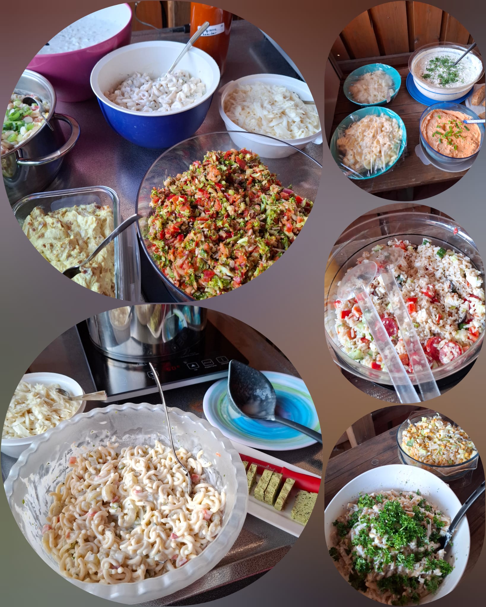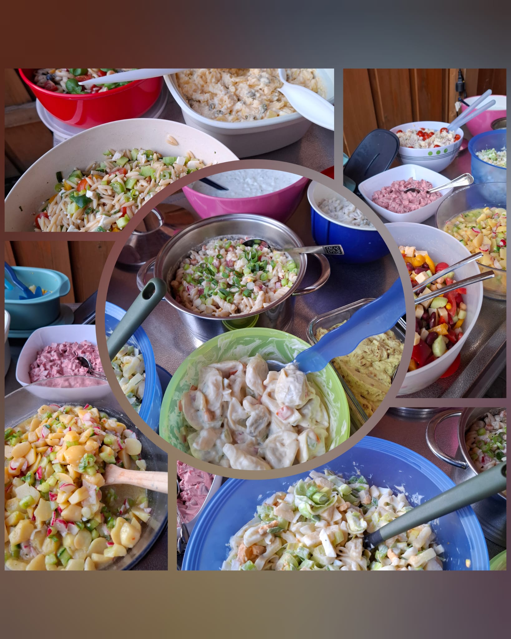 Ab 18:00 Uhr begann dann das Camperbuffet mit Grill. Ich brachte meinen Salat zum Biergarten rüber und konnte nur staunen. Dort standen unendlich viele Salate, Dips und Desserts. Dazu hatte das emsige „Orgateam“ einiges an Fleisch und leckeren Getränken organisiert. Kurzum - es war einfach ein großartiges Buffet und es hätte für den ganzen Ort gereicht. Sehr gut gesättigt und leicht angedüddelt ging es irgendwann wieder in die Womos. Anmerkung der Autorin: ich habe fast alle Salate durchprobiert und sie waren alle super lecker! Danke an die hervorragenden Köchinnen!