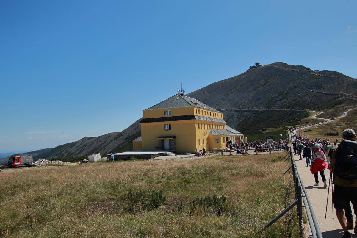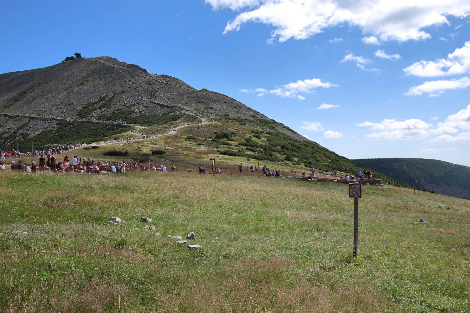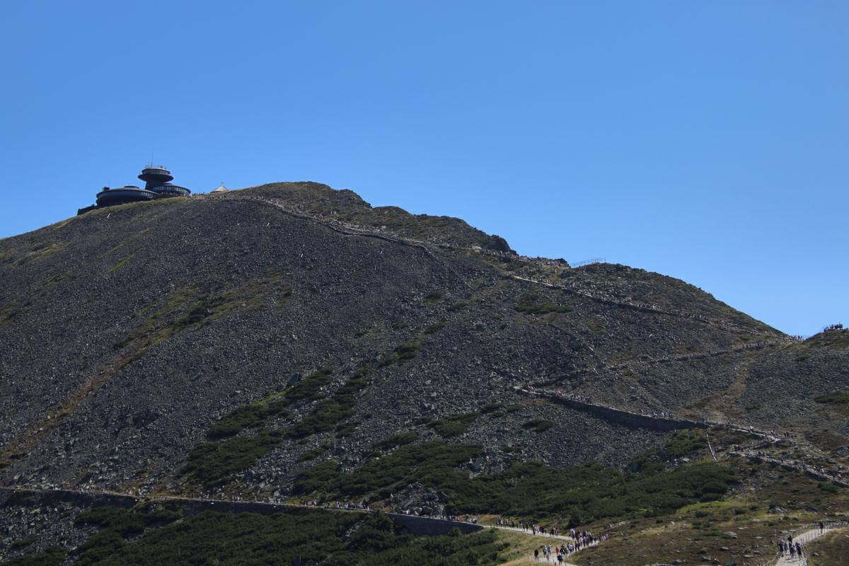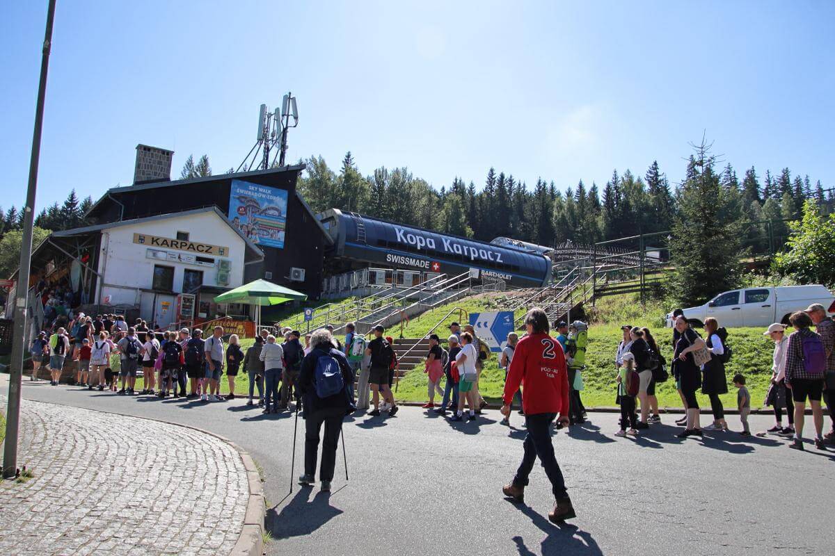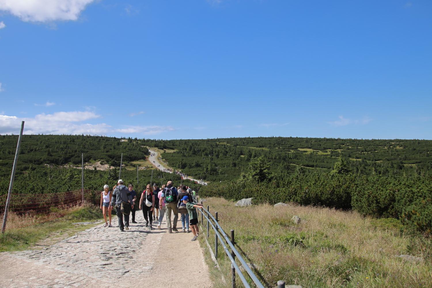Der Bus holt uns um 10 Uhr ab. Reiseführer Antoni erzählt uns auf der Fahrt zur Schneekoppe alles Wissenswerte zu der Gegend und Geschichte. Landschaftlich wunderschön ist die Fahrt durch das Riesengebirge. In Karpacz angekommen, geht es mit dem vierer Sessellift zunächst hinauf und dann zu Fuß zum Schlesierhaus. Die Bergwelt war beeindruckend. Es überraschte uns, dass trotz Montag so viele Menschen unterwegs sind. Auf den Fotos sieht man die Karawanen den Berg hinauf gehen. Aber es ist ja auch Ferienzeit. Die meisten von uns gehen vom Schlesierhaus aus den Weg hinauf auf die Schneekoppe (1.603 Meter hoch). Anstrengend, steil und steinig. Aufstieg ca. 40 Minuten. Einer von uns hat es tatsächlich in 22 Minuten geschafft. Wir hatten sehr gute Sicht, was nicht selbstverständlich ist. Aufgrund der geographischen Lage ist die Sicht von der Schneekoppe an rund 300 Tagen im Jahr durch Nebel und Wolken eingeschränkt.