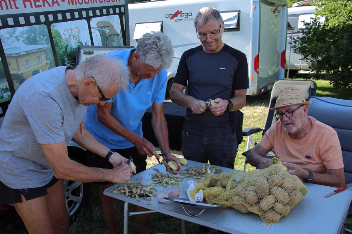 17.30 Uhr Aufruf an alle Männer zum Kartoffeln schälen. Das hat bereits Tradition. Anna und Matthias braten Unmengen Reiberdatschi. Dazu Apfelkompott und saure Sahne. Lecker!