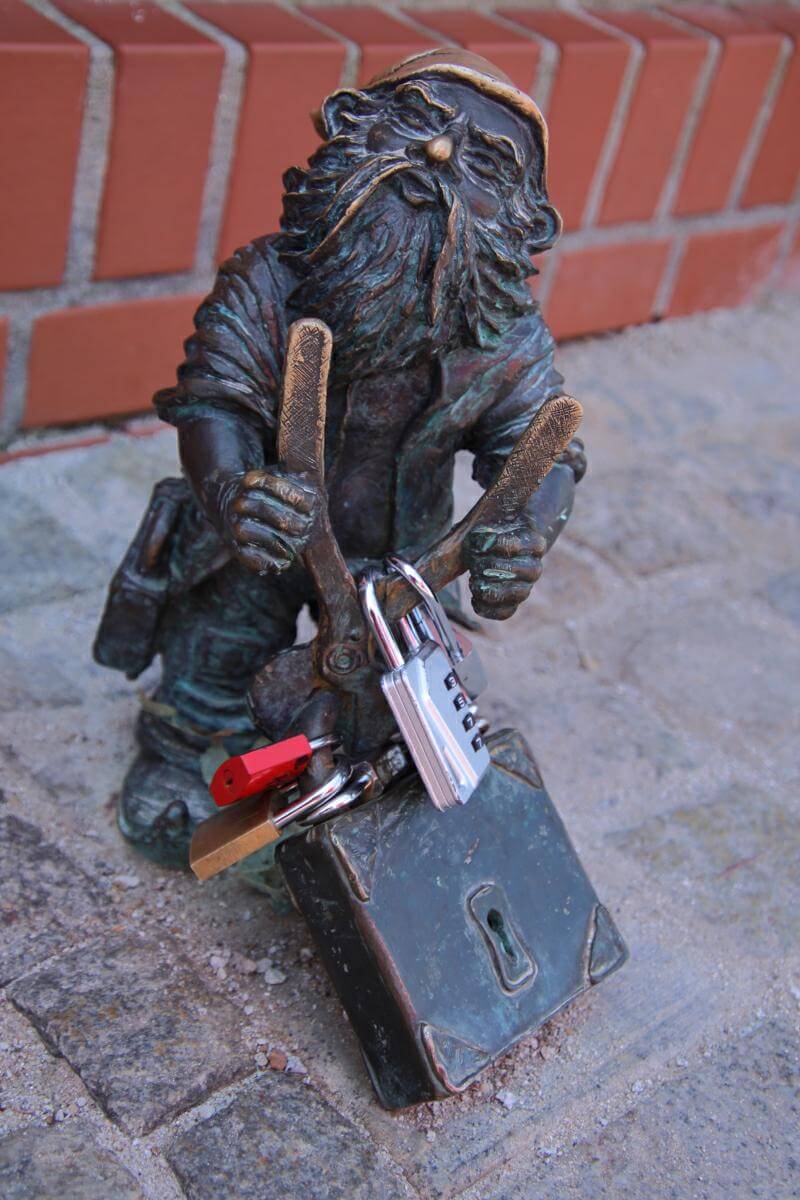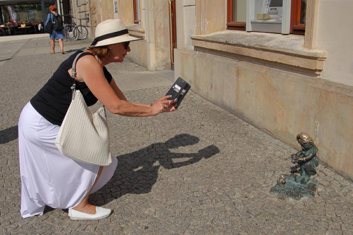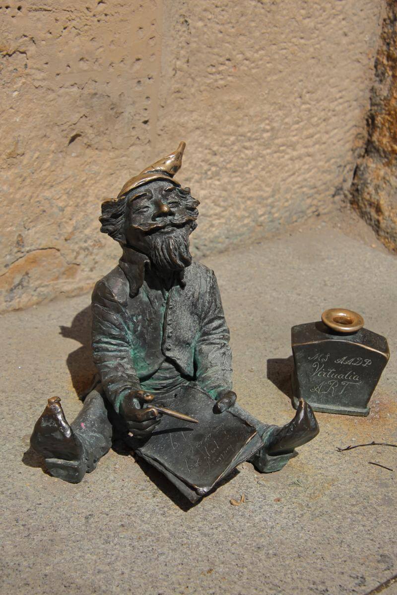 Nach dem Essen hat uns André noch weitere Highlights gezeigt. Dabei fielen uns die vielen kleinen Zwerge aus Bronze auf, die überall in der Stadt versteckt waren. Entstanden sind sie aus einer Untergrundbewegung während der kommunistischen Diktatur in Polen. Diese Untergrundbewegung „Orange Alternative“ malte kleine Zwerge über die weißen Flecken, die die Behörden zum Überdecken oppositioneller Parolen nutzte, als humoristische Form des Widerstandes. Nach 1989 gab es keine politische Notwendigkeit mehr, aber die Bilder von den Zwergen blieben im Gedächtnis. 2001 wurde der erste Zwerg aus Bronze enthüllt, als Erinnerung an die „Orange Alternative“. Daraus entwickelte sich eine Tradition und Künstler und Initiativen begannen überall in der Stadt kleine Zwerge aus Bronze aufzustellen. Mittlerweile gibt es über 600. Letztendlich war man sich einig nicht alle Zwerge sehen zu wollen und so waren doch alle froh als es zum klimatisierten Bus ging.