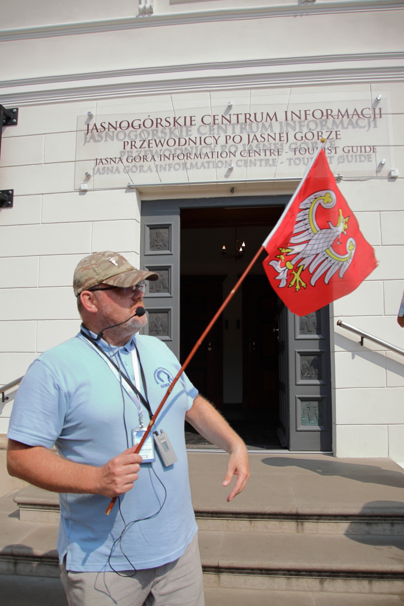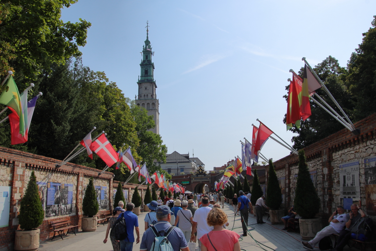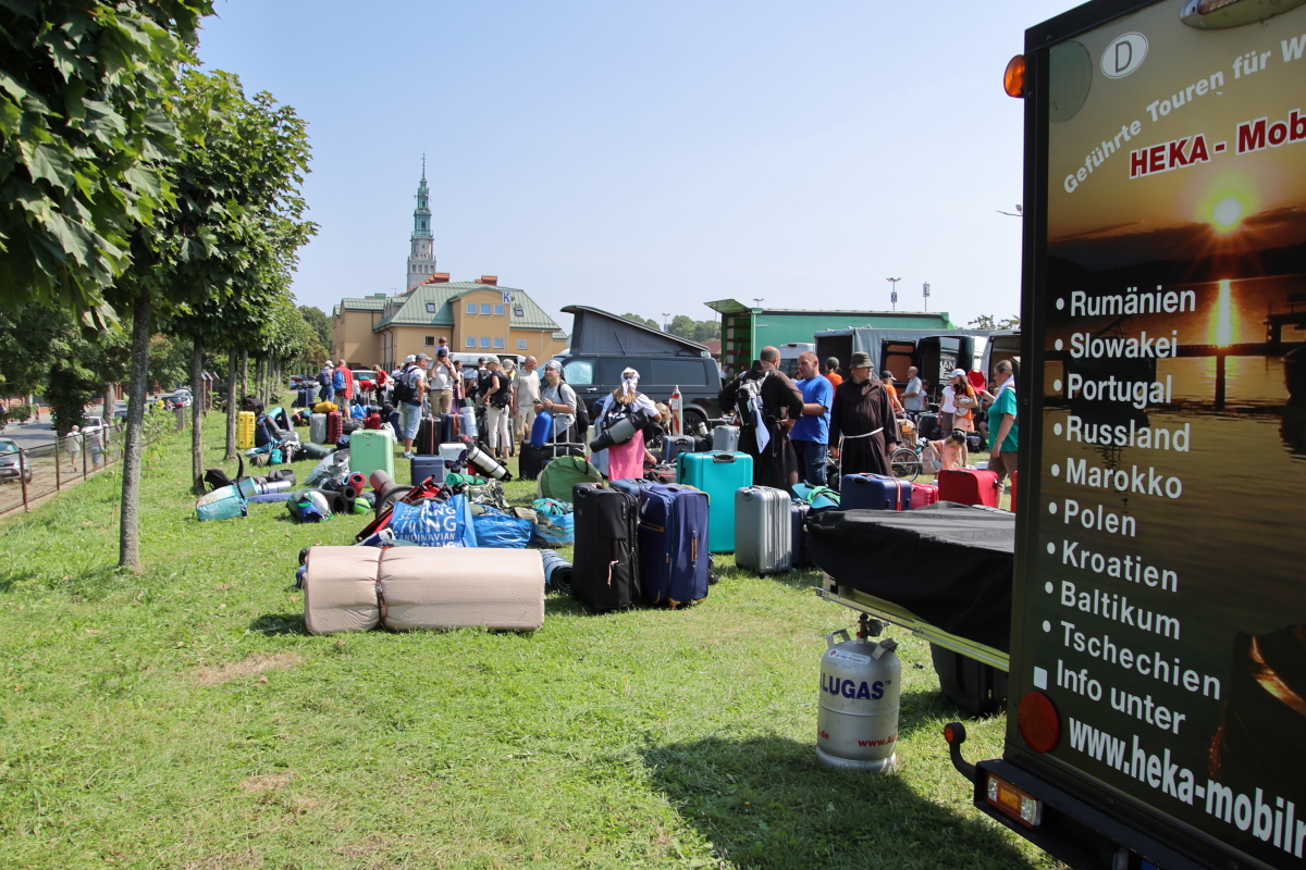 Gestern im Kloster geschätzte 30.000 Besucher aufgrund des Feiertags Mariä Himmelfahrt. Am Morgen hören wir Musik und Gesang. Direkt vor unseren Wohnmobilen gehen Pilgergruppen vorbei. Sie kommen aus unterschiedlichen polnischen Regionen und anderen Ländern. Bunt - mal alle in orange oder rot oder gelb gekleidet, fröhlich mit vielen jungen Leuten und Kindern. Gesang und Gebete über Lautsprecher. Sie ziehen zu dem großen Platz vor dem Kloster. Dort findet zusätzlich zu dem Gottesdienst in der Gnadenkapelle eine Messe statt.