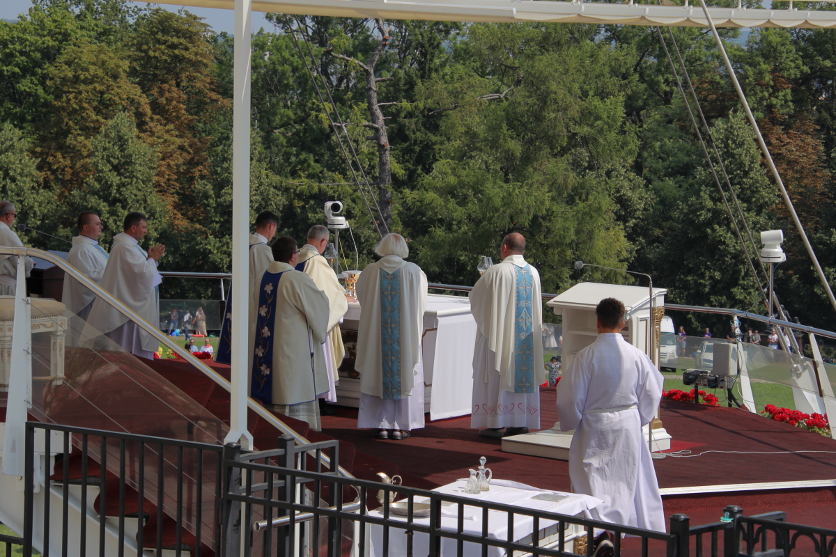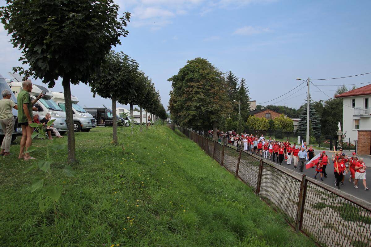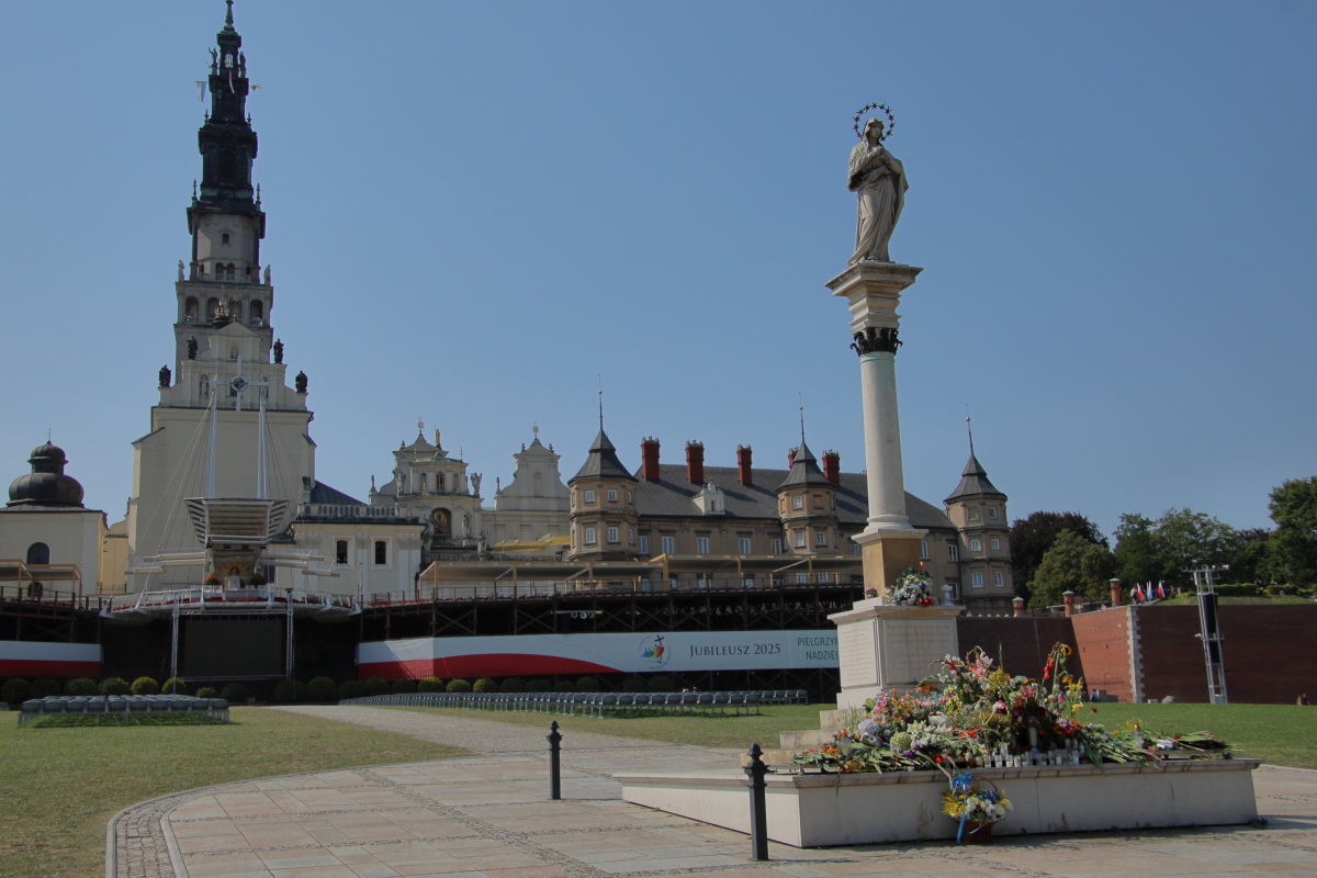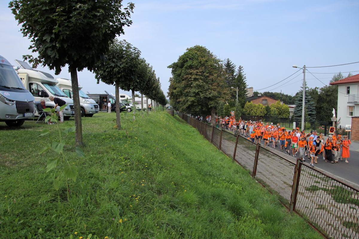 Gestern im Kloster geschätzte 30.000 Besucher aufgrund des Feiertags Mariä Himmelfahrt. Am Morgen hören wir Musik und Gesang. Direkt vor unseren Wohnmobilen gehen Pilgergruppen vorbei. Sie kommen aus unterschiedlichen polnischen Regionen und anderen Ländern. Bunt - mal alle in orange oder rot oder gelb gekleidet, fröhlich mit vielen jungen Leuten und Kindern. Gesang und Gebete über Lautsprecher. Sie ziehen zu dem großen Platz vor dem Kloster. Dort findet zusätzlich zu dem Gottesdienst in der Gnadenkapelle eine Messe statt.