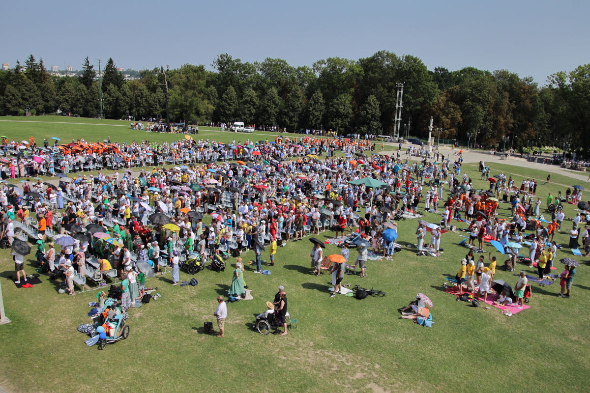 Draußen vor dem Kloster Hunderte auf der Wiese, die dort an einer weiteren Messe teilnehmen. Bei Hitze, ohne Schatten.