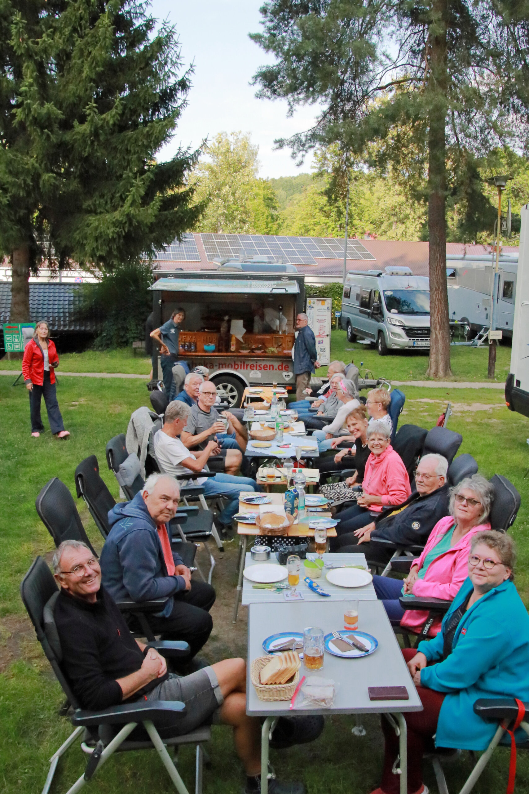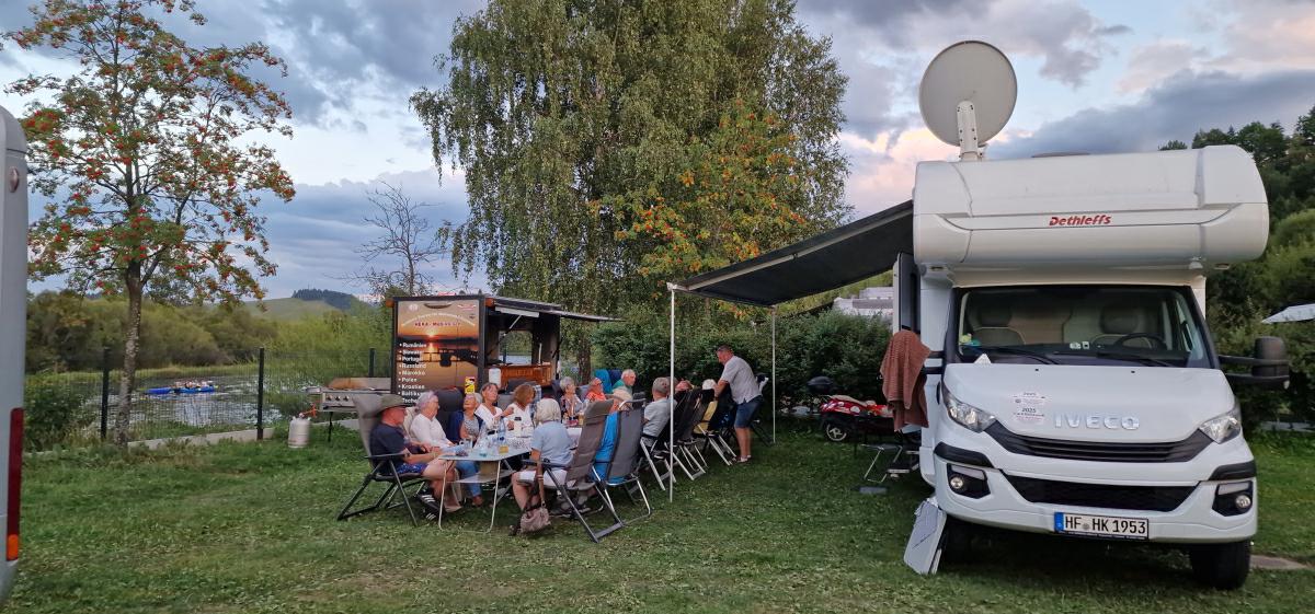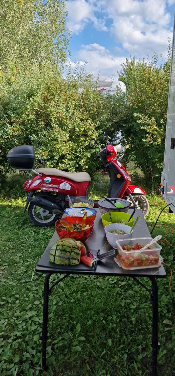 Zurück am Campingplatz bildete sich schnell eine lange Tischreihe, wo wir über allerlei Dinge zur Anfahrt, insbesondere zur eToll diskutieren konnten. Denn zwei weitere Fahrzeuge mussten sich bei eToll anmelden, da die vom ADAC gekaufte Mautbox nicht funktionierte.