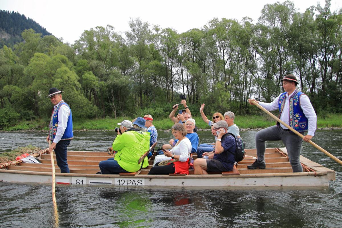 Unser Abenteuer begann im Pieninski Park Narodowy, wo wir auf traditionelle Holzflöße stiegen, die von erfahrenen Flößern gesteuert wurden. Schon beim Ablegen war klar: das wird keine gewöhnliche Bootsfahrt. Die Flößer begrüßten uns mit Scherzen, die wahrscheinlich schon seit Generationen erzählt werden – aber genau das machte den Spaß aus. Der Dunajec schlängelt sich durch eine spektakuläre Schlucht (18 km, teilweise Slowakei) links und rechts ragen die Felsen steil nach oben. Während wir gemütlich auf dem Wasser trieben, wurden wir von den Bergen fast ein wenig „bewacht“. Die Flößer zeigten uns Felsformationen, die angeblich wie verschiedene Tiere oder Gestalten aussehen. Mit etwas Fantasie konnte man wirklich einen schlafenden Hund oder eine riesige Krone erkennen. Nach einigen Flussschlingen erreichten wir schließlich Szczawnica. Am Ende waren sich alle einig: die Dunajec-Fahrt war ein beeindruckendes Naturerlebnis und genau das macht sie so unvergesslich. Dieser Ausflug wurde mit einem Restaurantbesuch abgerundet.