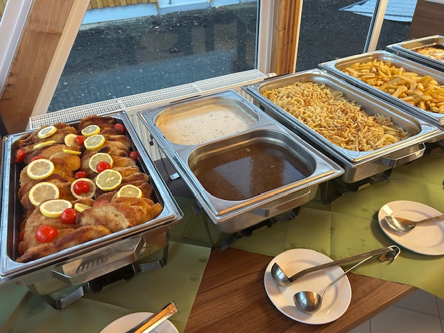 Nach einer Pause begaben wir uns um 18 Uhr gemeinsam zum Abendessen ins Restaurant. Es wurde ein Schnitzelbuffet angeboten, das wie die anderen Gerichte aus eigener Küche zubereitet wurde.